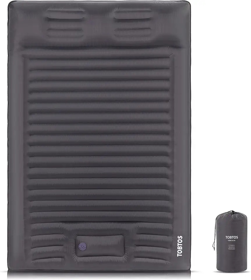 Extra-thick 6-inch double sleeping pad for two people includes built-in foot pump and shared pillow for quick inflation and comfort. Spacious design prevents rolling together; good insulation keeps both warm. Packs reasonably for car camping or travel. Durable material resists punctures – ideal for couples, friends, or family wanting shared, restful sleep outdoors.